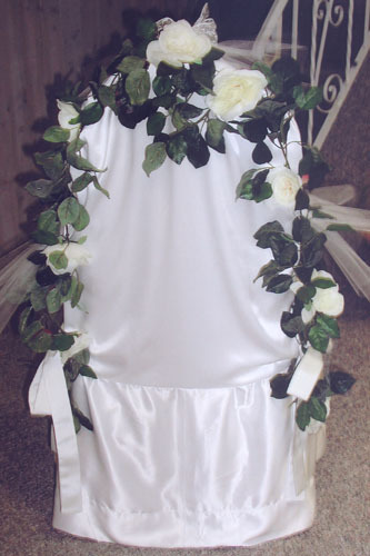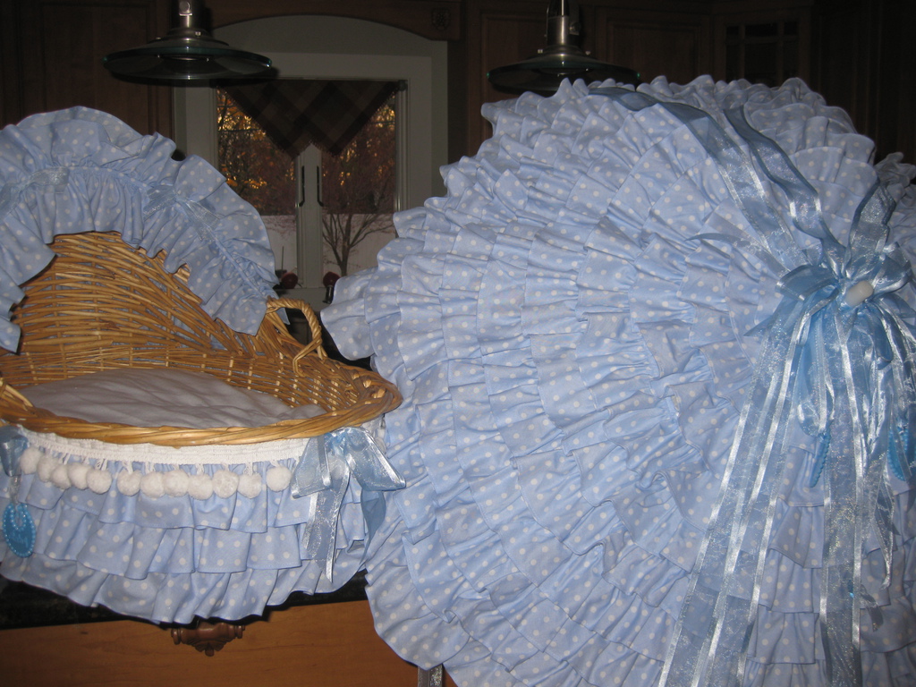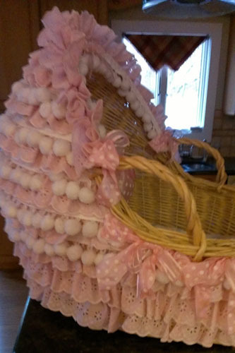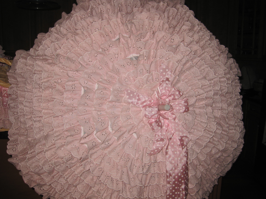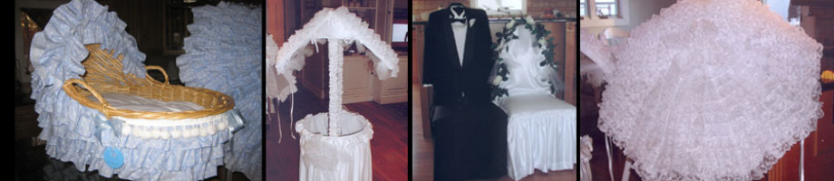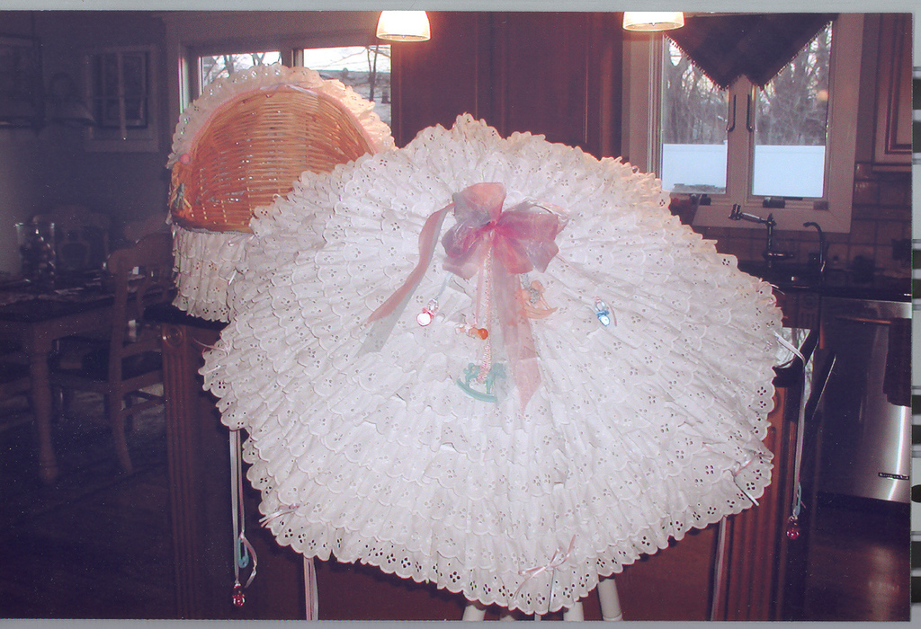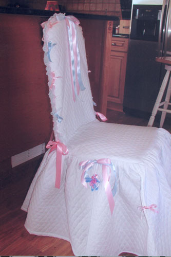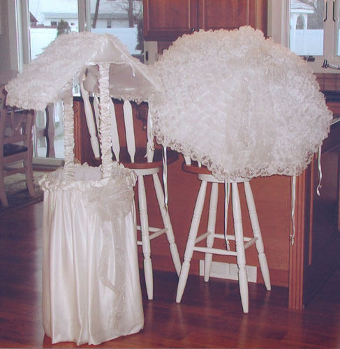 And for the traditional mom-to-be, we also carry a white eyelet umbrella and bassinet wishing well with pink & blue ribbons. The white quilted chair cover is adorn with matching pink & blue ribbons.